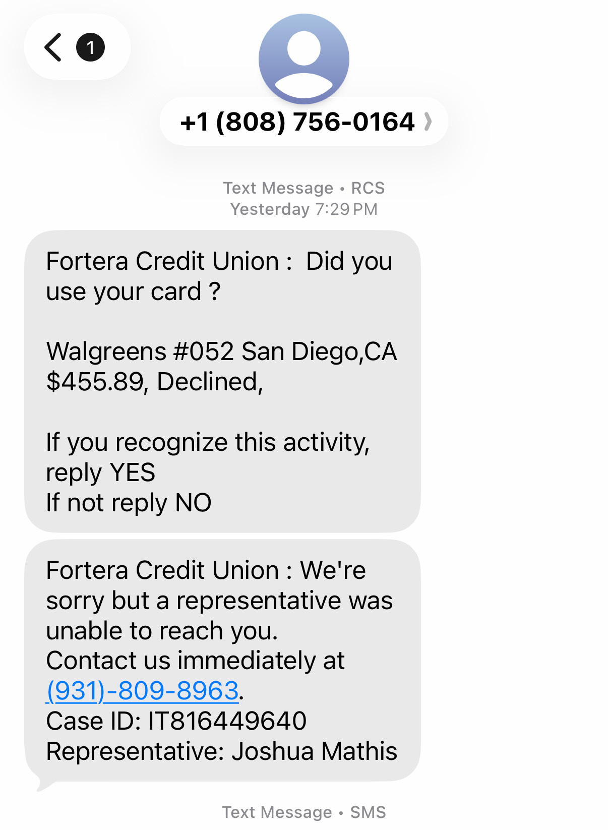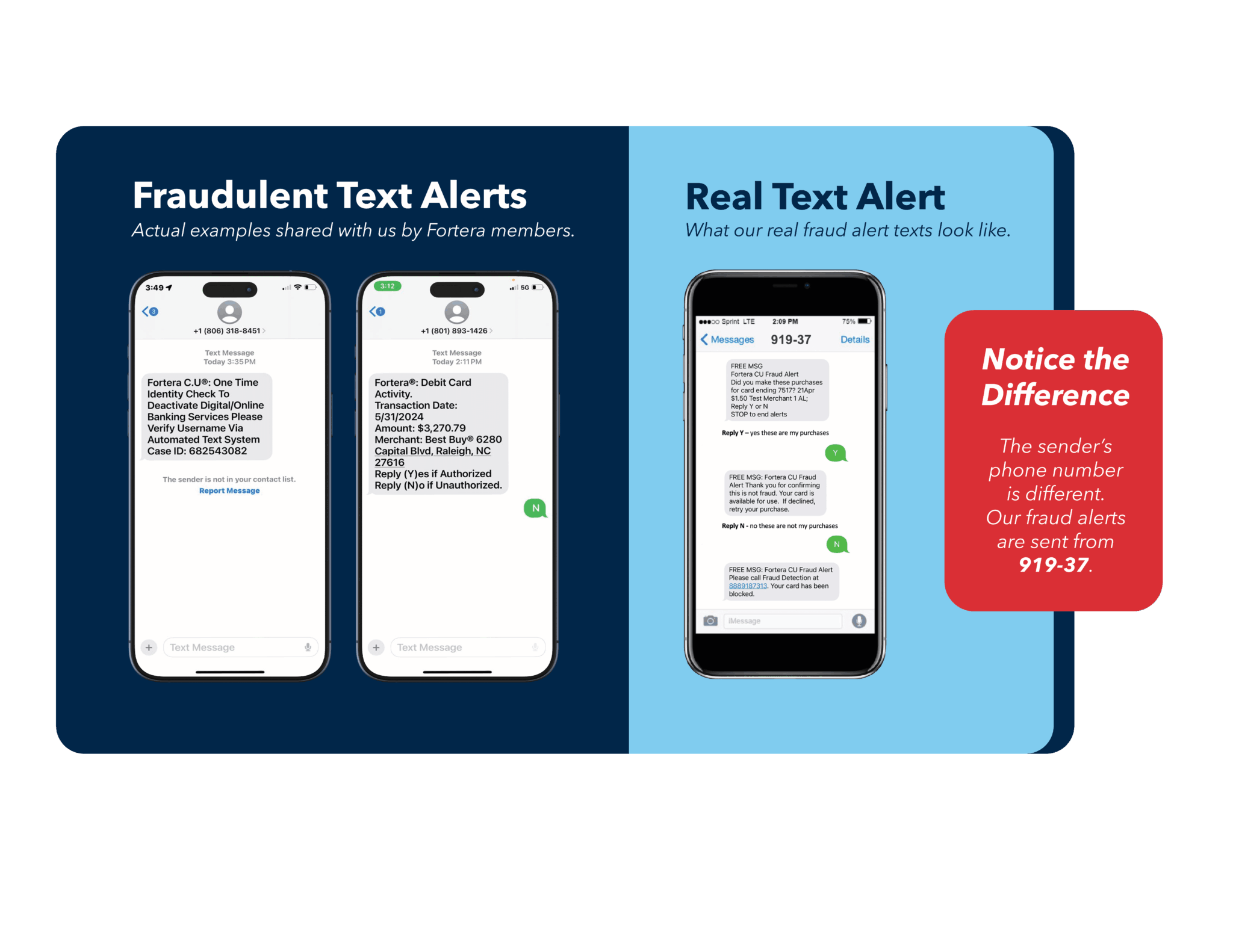We recently became aware of an account activity scam targeting some of our members. Scammers are text messaging members pretending to be from Fortera and saying they need to verify a pending charge. Before they can verify the charge, they ask you to call and they will attempt to get additional information from you like your card number, online banking login, or social security number. As a reminder, never give your online or mobile banking user ID and password combo, full account or card number, PIN number, 3 digit CVV Security Code, or full Social Security Number unless you called us directly at 931-431-6800.